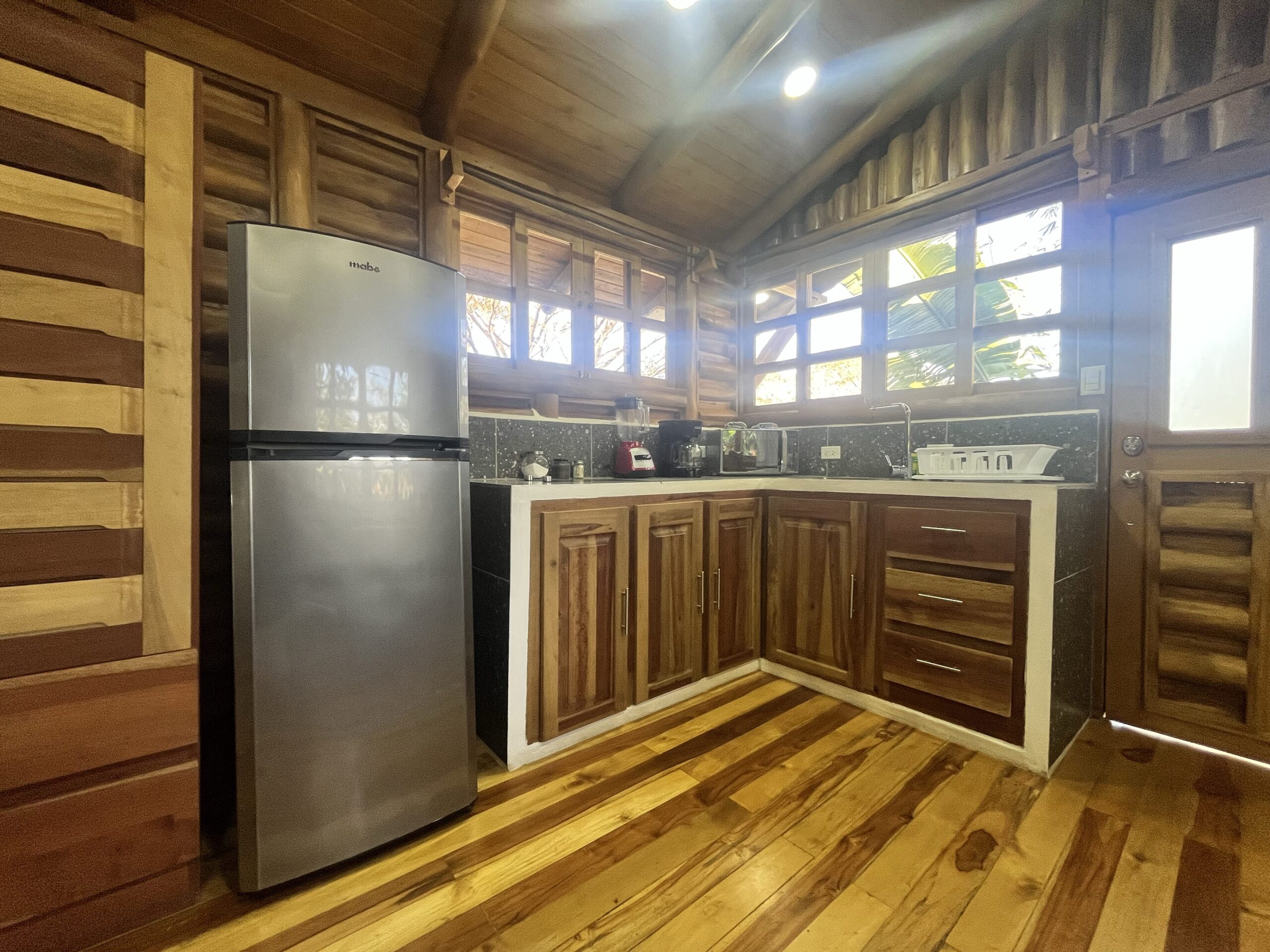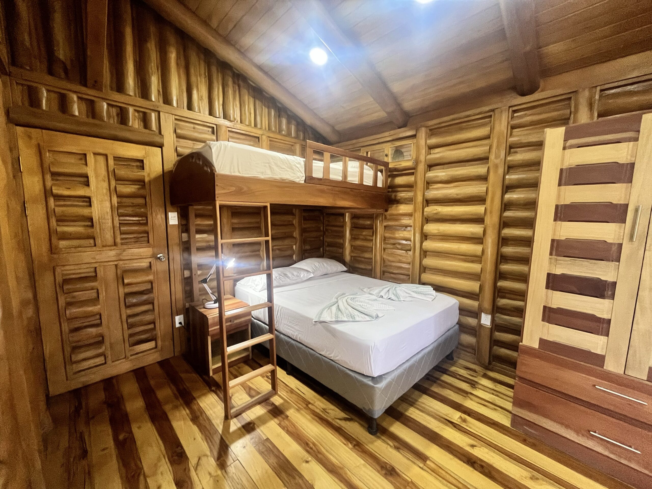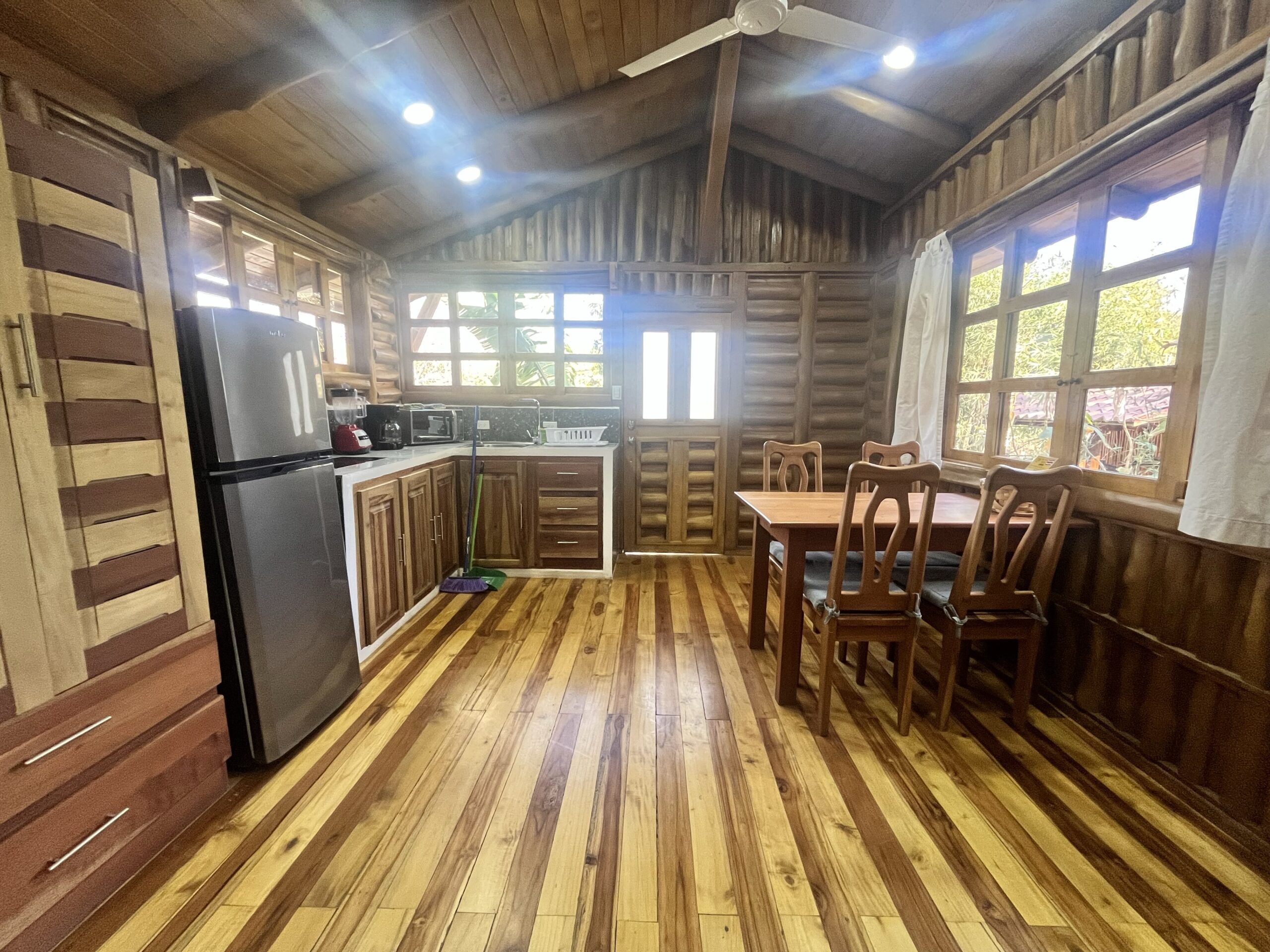 The Buena Vista Cabins consist of four charming, fully equipped units, each featuring air conditioning, a private bathroom, and a fully equipped kitchen. Two units offer one double bed, while the other two include one double bed plus a double bed and a single bunk bed, allowing for a total capacity of up to 10 guests.