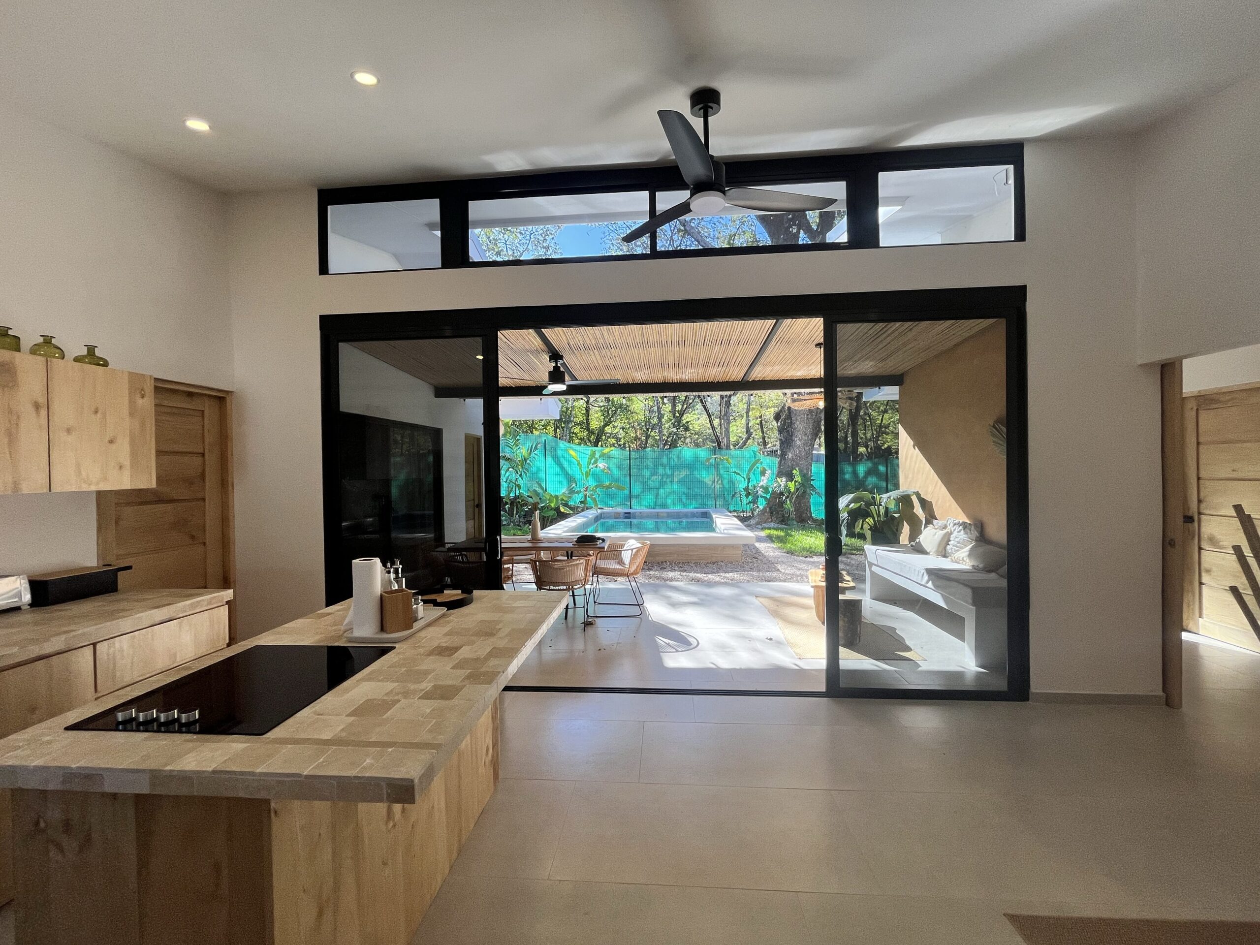 Built with reinforced concrete block and quality finishes throughout, the house is made for comfort, longevity, and effortless living in a tropical climate. Expansive sliding glass doors open the living and kitchen areas onto a covered terrace and pool deck, allowing indoor and outdoor spaces to flow seamlessly together.