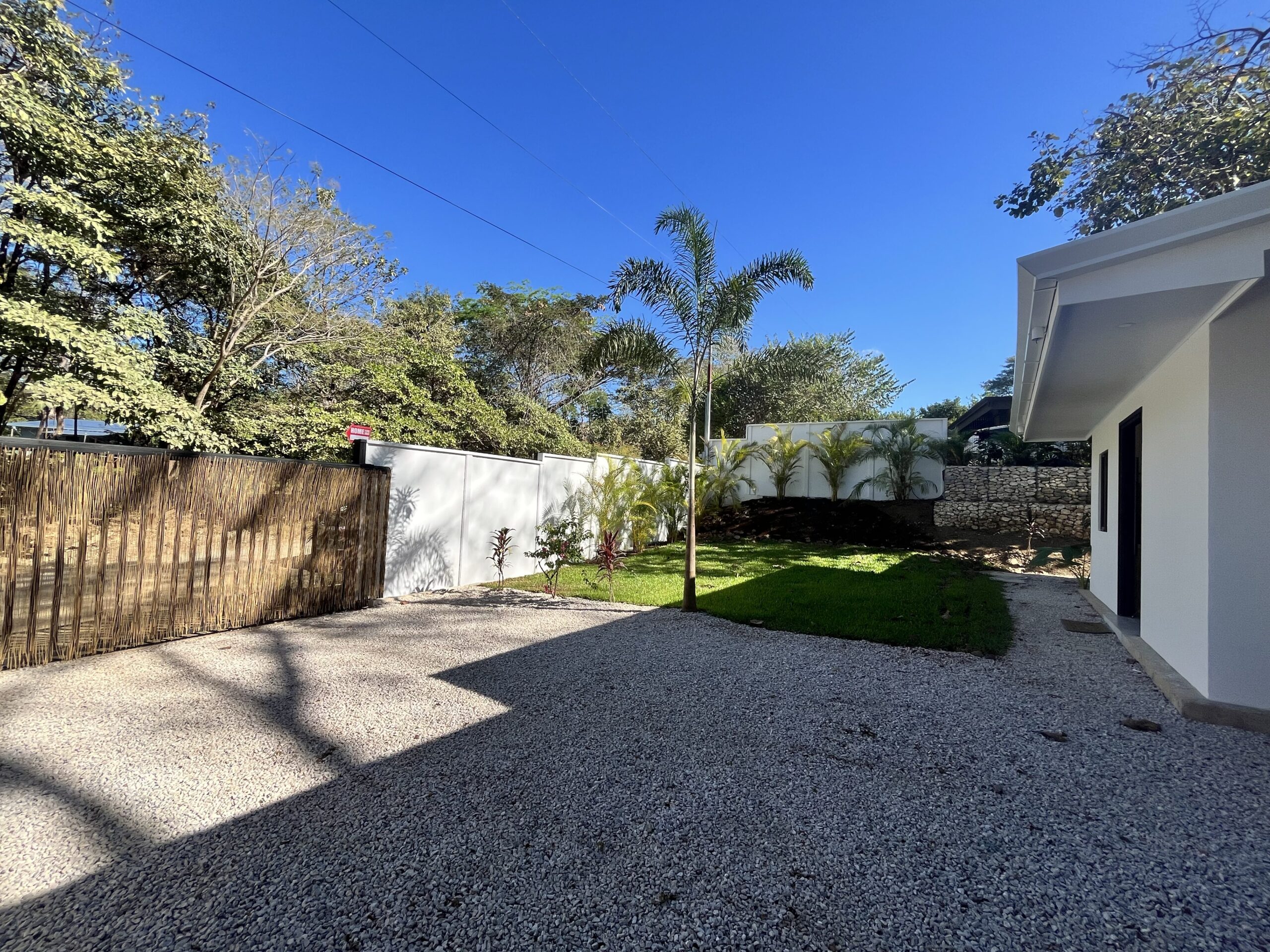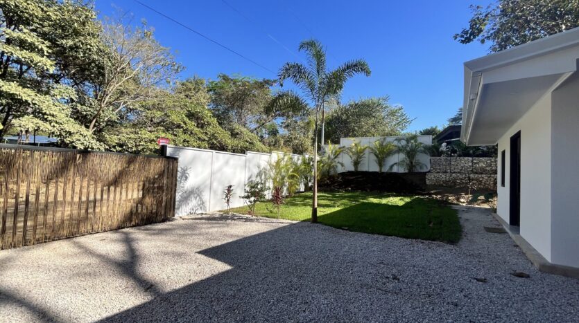 The landscaped garden is highlighted by a mature Guanacaste tree, providing shade and a striking natural centerpiece that gives the property its own unique character.